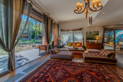 Sala ampla com uma area generosa de 72 m², lareira com recuperador de calor, muita luz natural e vista para o jardim e piscina.