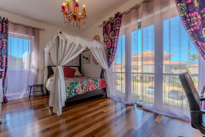 Três suites espaçosas, incluindo uma master suite com 30 m² e acesso a uma varanda com vista para jardim com casa de arvore.