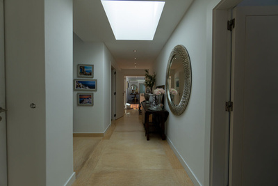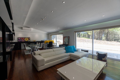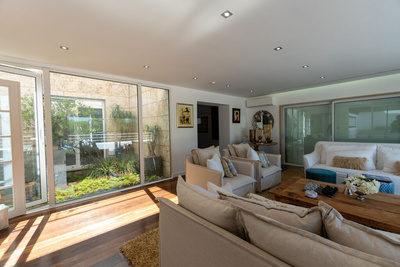 • Sala de estar com pé-direito generoso e luz natural abundante